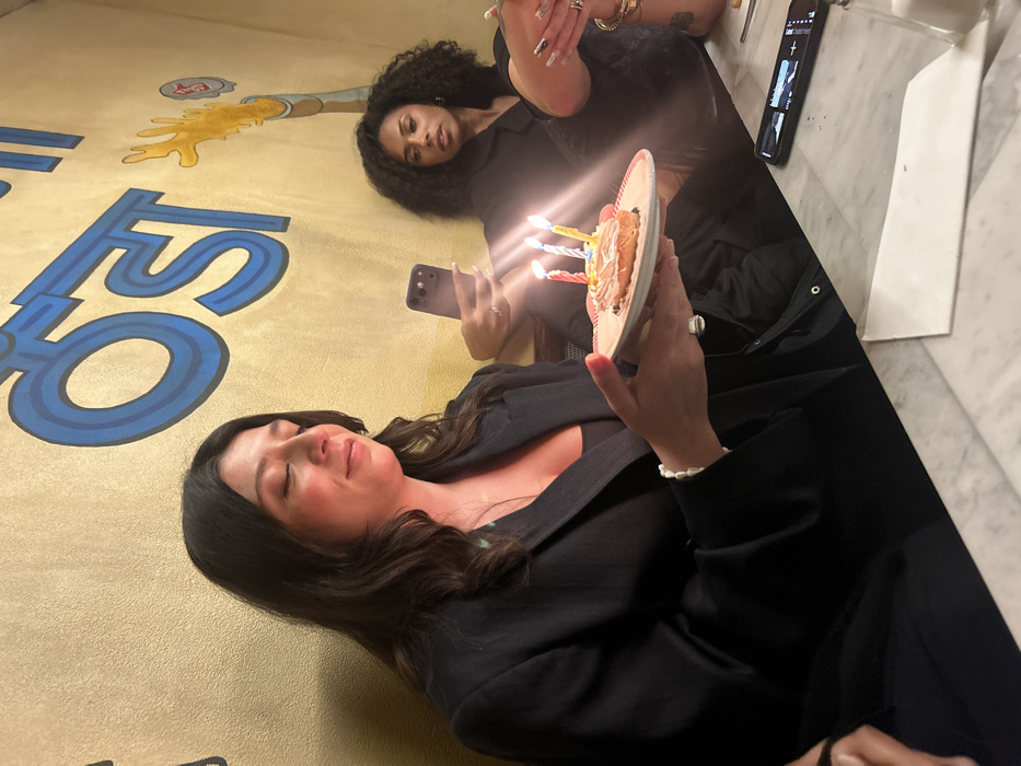 This image depicts an indoor scene at the TOAST - Indian Street Food restaurant, located in Paris, France. The primary subject is a woman with long dark hair, wearing a dark blazer over a low-cut dark top. She is positioned slightly left of center, holding a small, light-colored plate containing a pastry-like item with three lit birthday candles. Her eyes are closed or downcast, and she exhibits a gentle smile. She wears a white beaded bracelet on her left wrist and a silver ring on her right ring finger. To her right and further back, a second woman with dark, curly hair is visible. She is holding a dark-colored smartphone, aimed towards the primary subject, appearing to record or photograph the scene. Her long fingernails are visible. A third person's arm is partially visible on the far left edge of the frame. The subjects are seated at a table with a white, possibly marble, surface. Visible on the table are a folded white paper napkin and a portion of a clear shaker. The background wall is painted a golden-yellow color, featuring large blue Devanagari script that reads "ठोस" (TOAST), and to its right, a stylized mural depicting a yellow liquid pouring from a tap. The scene is illuminated by ambient light and the bright flames of the birthday candles.