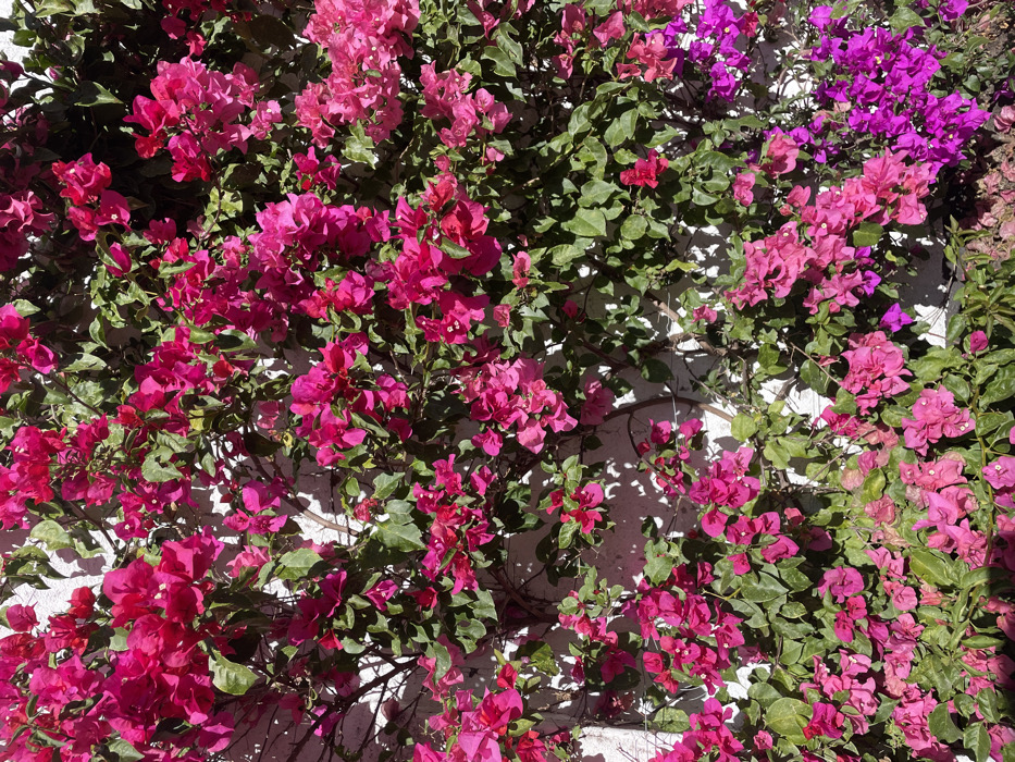 - "A vibrant display of pink and purple bougainvillea flowers cascades against a white wall" by FM-otcHd2, licensed under CC BY 4.0