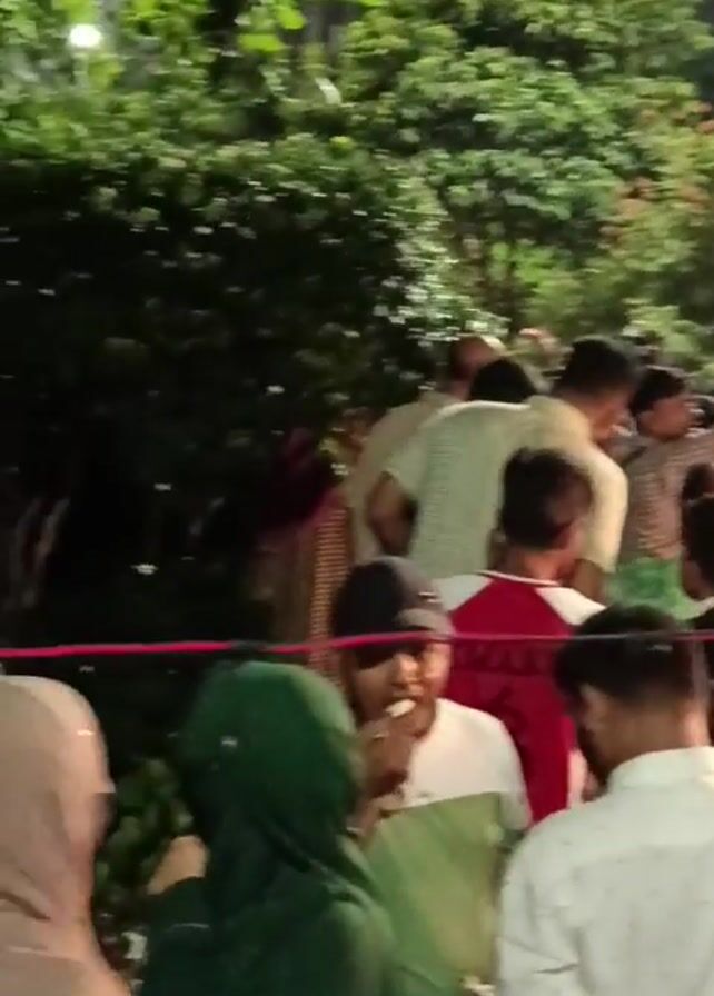 crowded outdoor scene at night. Numerous people are gathered, with some individuals attempting to see something in the distance, possibly elevated. The crowd includes men, women, and children. Some individuals are wearing traditional attire, such as hijabs, while others are in casual clothing. The background includes trees, buildings, and streetlights that illuminate the scene. There is a food vendor stall visible on the right side of the frame. The overall atmosphere appears festive and lively, with people closely packed together.