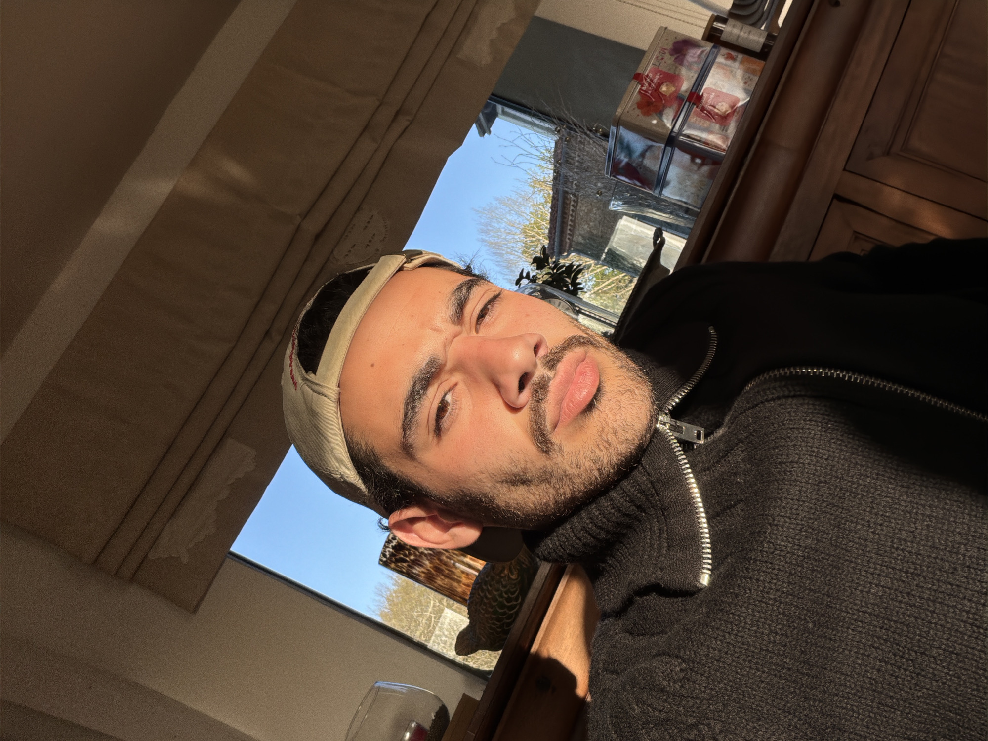 A selfie captured in a domestic interior, possibly in the city of Mauléon-d'Armagnac, France, based on the query. The subject is a young man with a beard, wearing a tan baseball cap and a black zip-up sweater over a turtleneck. He is positioned close to a window, with sunlight illuminating his face and the surrounding room. Outside the window, there are trees and the roof of a building is visible. On a shelf adjacent to the window, there are glass containers, possibly filled with items.