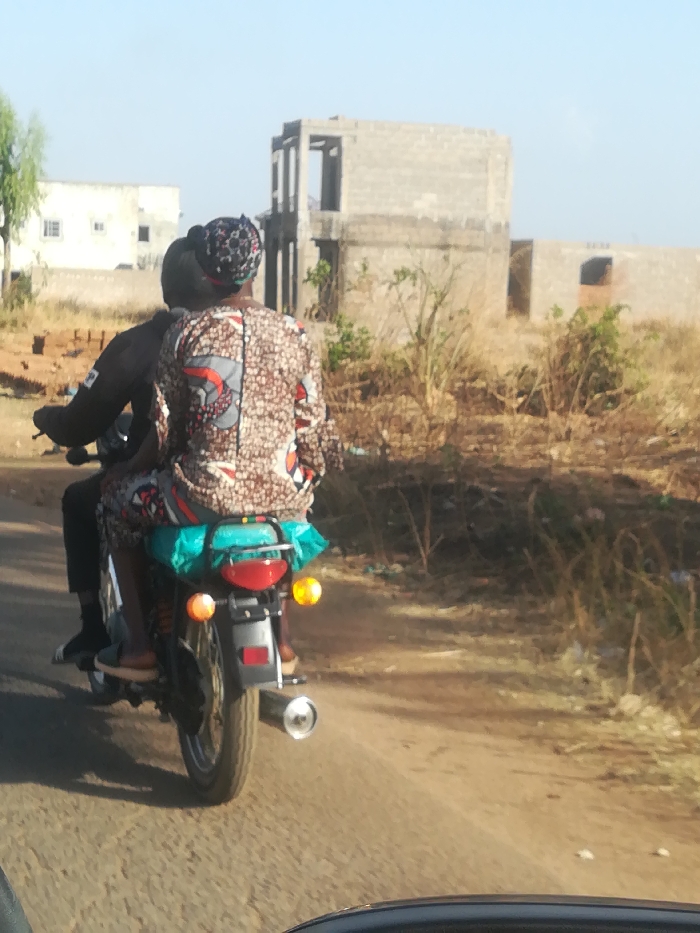 Two people are riding a motorcycle down a paved road. The passenger in the back wears a colorful printed dress and head covering. The driver wears a dark jacket and helmet. The motorcycle has a teal bag strapped to the back. An unfinished grey brick building sits on a dry, grassy lot in the background. Another building can be seen in the distance. The photograph appears to be taken from inside a vehicle, looking out through the windshield.