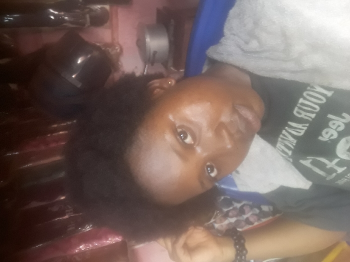A close-up, slightly upward-angled portrait photograph depicts an adult female positioned centrally in an indoor commercial setting, likely a hair salon, in the city of Unknown, Unknown. The subject has dark skin, dark, voluminous, natural hair, and a neutral expression, looking directly at the camera. She is wearing a dark t-shirt with light-colored, reversed text visible across the chest, and a light-colored towel is draped over her shoulders. A dark beaded bracelet adorns her left wrist, and a small gold-colored earring is visible in her right earlobe. Her left arm is bent, with her hand near her ear. The background features rows of packaged hair extensions or wigs on the left. To the right, a black hooded hair dryer is visible, positioned above a metallic pot with a lid. The background wall is painted a light pink or peach color. A blue object, consistent with a chair, is partially visible beneath the subject.