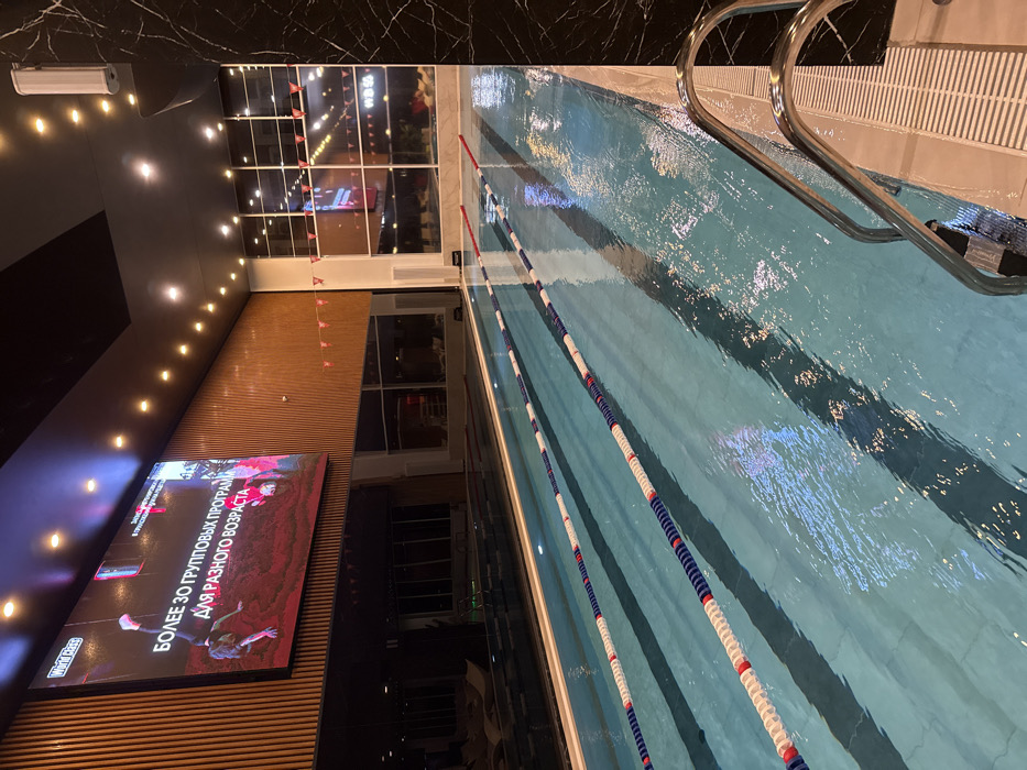 A swimming pool with two marked lanes occupies most of the frame. One lane is closer to the viewer with a ladder, and the other is further. The water is blue, and its surface reflects light. Red and blue lane markers stretch lengthwise. Adjacent to the pool, a wall features a large screen displaying an advertisement. The screen shows images and text in Russian. The wall is decorated with wood paneling and lighting, with a large glass window next to the screen.