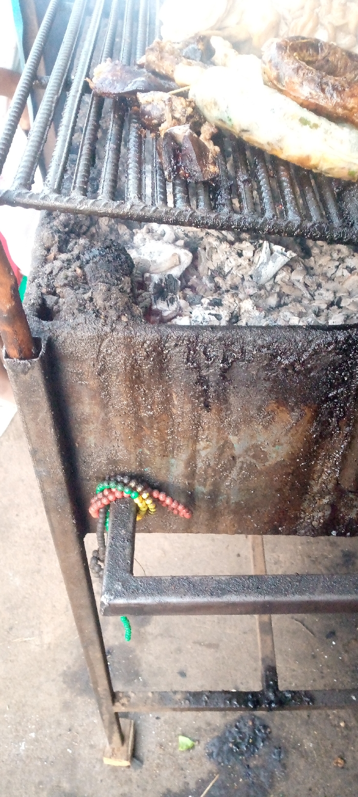 A well-used, blackened metal grill holds various meats, including sausage and unidentified cuts. Beneath the grill, hot coals glow. A string of colorful beads hangs from the grill's frame, contrasting with the grimy surface. The grill sits on a metal stand, with evidence of burnt debris on the ground below. The setting appears to be an outdoor cooking area.