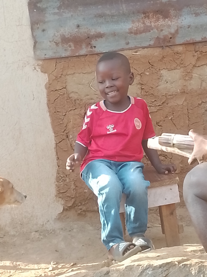 A young child wearing a red jersey, blue jeans, and sandals sits on a small wooden stool outside. The background includes a wall with a weathered texture and a corrugated metal sheet above it. A dog's head is visible to the left, and a hand and leg are present on the right. The child smiles with closed eyes, creating a cheerful and candid scene. The overall lighting suggests a sunny day.
