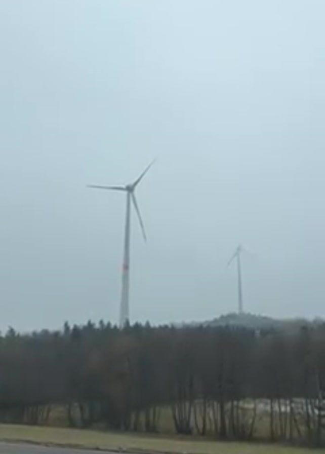 view from inside a car of two windmills on a misty day. The foreground includes a road and trees. The windmills are visible on a hill in the background, with the larger one closer to the camera. It has three blades, with one blade having a red tip. The second windmill is farther away and appears smaller. The sky is overcast, creating a gray backdrop.