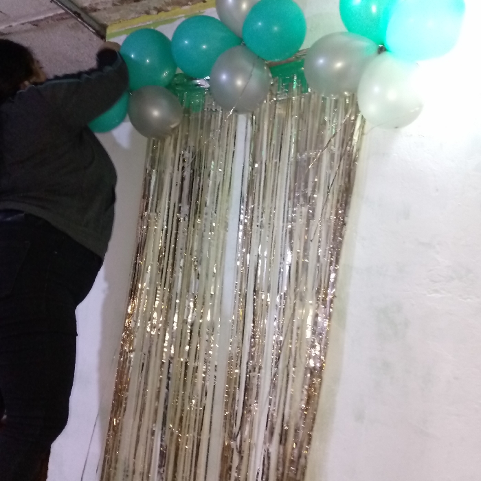 This image, captured in the city of Juan Griego, Venezuela, displays an indoor scene where an individual is arranging party decorations