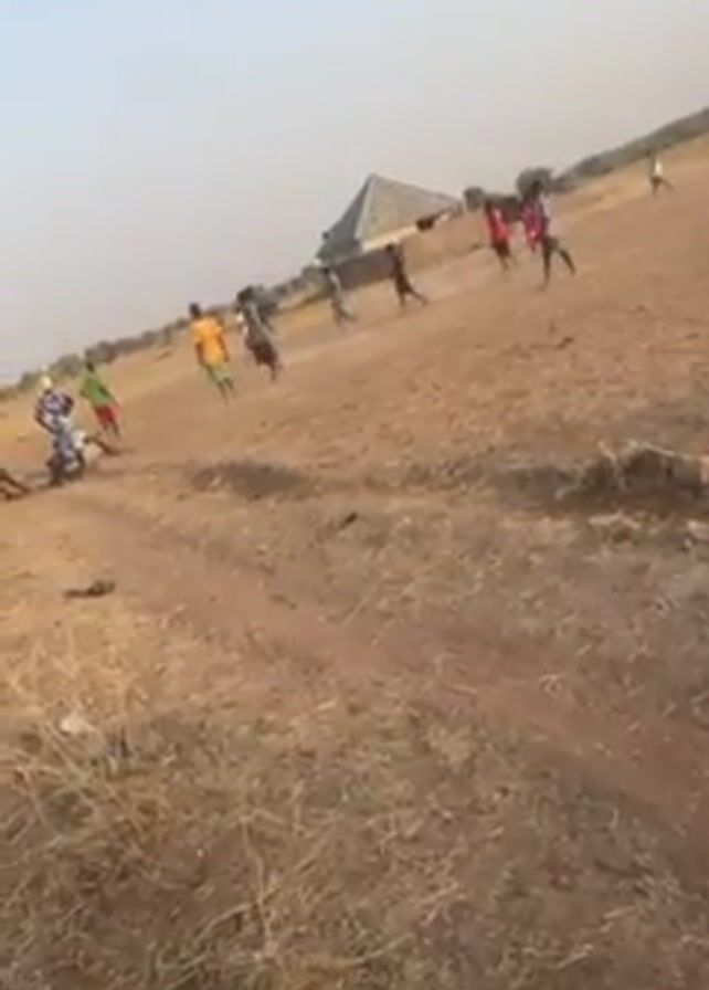 The video depicts a group of people, primarily children, engaged in a game of soccer on a dry, dusty field