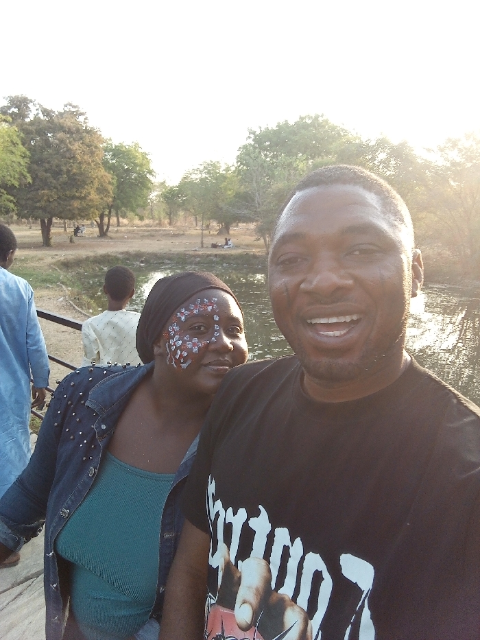 A man and woman pose for a selfie outdoors. The woman wears face paint and a denim jacket. The man wears a black t-shirt with a graphic design. A body of water and trees are visible in the background. Other people are visible at a distance. The sun is shining brightly, creating a glare.
