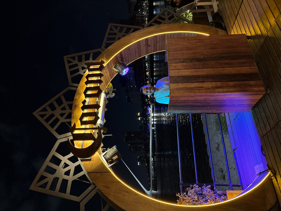 A sideways nighttime photo captures a person behind a wood-paneled structure within a semi-circular, illuminated arch. The archway is intricately designed with geometric shapes and a "Corona" logo, all illuminated by warm, golden light. A body of water and city lights are visible in the background. The wooden structure is bathed in blue light on its side.