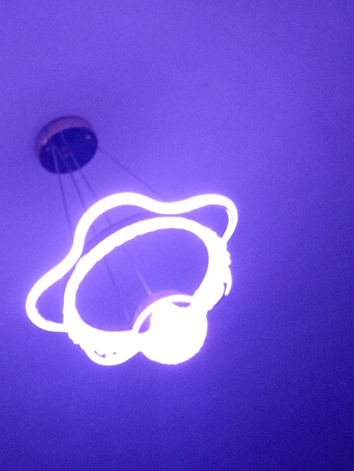 The image depicts an indoor scene in Ijoko, Nigeria, focusing on a modern ceiling light fixture. The fixture, positioned against a solid purple ceiling, features a brass-toned circular base mounted to the ceiling surface. Several thin, dark suspension wires descend from this base, supporting a complex, curvilinear light element. This element, emitting bright white light, forms an abstract, glowing structure composed of interconnected, irregular oval and circular shapes. A prominent, intensely illuminated circular component is visible at the lower center of the light assembly. The entire scene is bathed in a purple hue, indicative of the ceiling color or ambient lighting conditions. No individuals, actions, or other discernible objects are present within the frame.