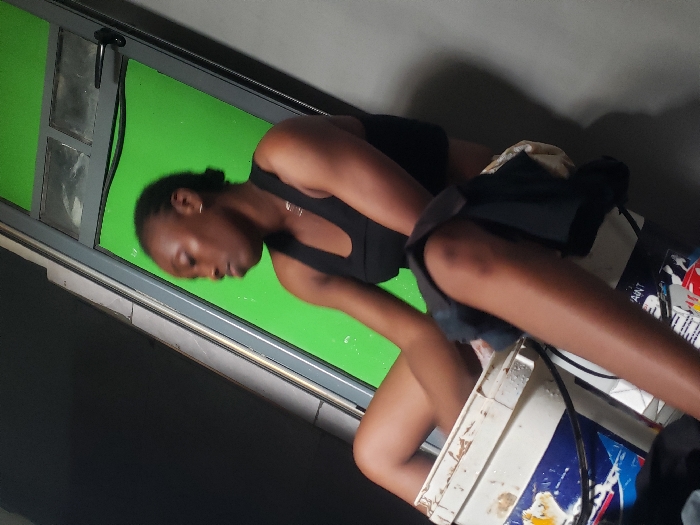 In Agunmo, Nigeria, an adult female is depicted in an indoor or sheltered setting. The individual, with dark skin and dark hair, wears a black top and a necklace, with an earring visible in her right ear. She is positioned with her right leg bent and partially submerged in a white plastic bucket containing dark fabric and possibly water. This bucket features blue, yellow, and red markings, including partial "PAINT" text. A second, similarly marked white plastic bucket is stacked directly below the first. A dark piece of cloth rests on her left thigh. Her gaze is directed downwards or away from the camera, and her face exhibits slight motion blur. The background consists of a diagonally angled green panel or door with window panes in its upper section. A dark, shadowed area is visible to the left of the green panel, and a gray wall is present to the right. The overall scene suggests a washing or soaking activity.