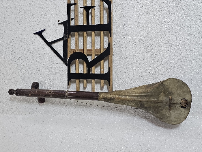 An ancient-looking, stringed instrument hangs on a textured white wall. It has a light-colored, rounded body and a long, dark-brown neck with turning pegs. A single string stretches across its length. Behind the instrument is a decorative piece made of thin wooden slats, with large black letters partially obscuring them. The letters spell out a word, but some parts are hidden.