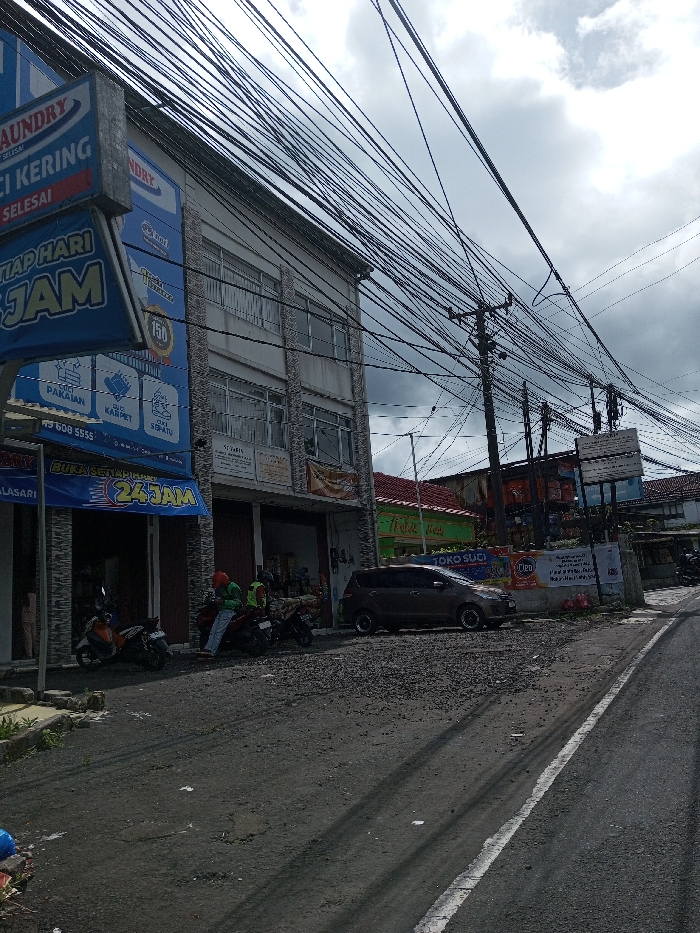 This image depicts a street scene in the city of Taohom, Laos, viewed under an overcast sky. On the left, a three-story commercial building with a light-colored facade features multiple windows and a prominent blue "LAUNDRY CUCI KERING" sign, advertising 24-hour service. Two motorcycles are parked on the unpaved shoulder directly in front of the building's ground-level storefronts; one is orange and black, and the other is dark-colored. A person wearing a bright green vest and a red helmet is seated on the dark motorcycle. To the right, a dark brown compact SUV is parked on the same gravelly shoulder, adjacent to a low concrete wall adorned with several advertising banners, including one for "Cleo" and another for "TOKO SUCI." Overhead, a dense network of black utility wires crisscrosses the sky, supported by a wooden utility pole positioned in the midground. The street in the foreground is asphalt, with a distinct white line delineating the right edge of the paved lane. Additional commercial buildings with various rooflines are visible further down the street on the right.