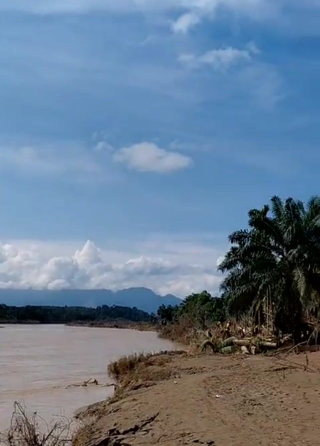 The video depicts a landscape scarred by a recent flood. A wide, muddy river flows through the frame under a bright sky scattered with fluffy white clouds. Debris, including uprooted trees and branches, litters the muddy riverbank. In the distance, lush green hills and mountains form a backdrop. As the camera pans across the scene, damage to vegetation, including trees and palm trees, is visible. In the background, houses are seen that appear to have been affected by the flooding. Three individuals walk across the sandy terrain toward the camera, one carrying something on their head. The overall scene conveys the aftermath of a natural disaster and the disruption it has caused.