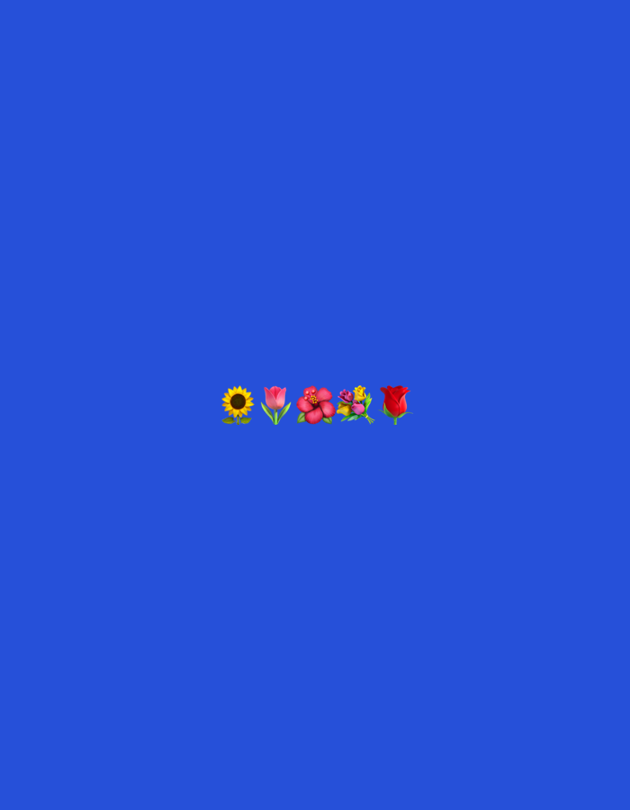 Centered on a blue background are five flower emojis. From left to right, there is a sunflower, a tulip, a hibiscus, a bouquet, and a rose. The emojis are spaced evenly and are positioned towards the bottom of the image.