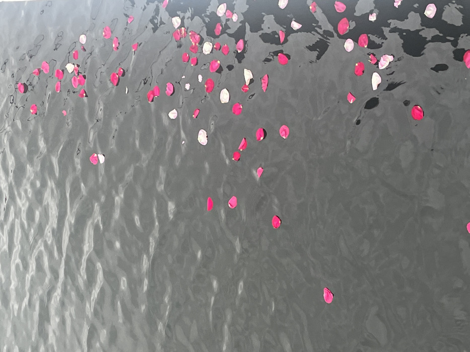 A body of water in Stockholm, Sweden, is depicted from an elevated viewpoint. The water surface is dark grey, characterized by subtle ripples. Floating on the surface are numerous flower petals, predominantly fuchsia and magenta, interspersed with some light pink or white petals. The petals are widely dispersed, with a notable higher density along the right side of the frame. No individuals, land formations, or man-made structures are visible within the image.