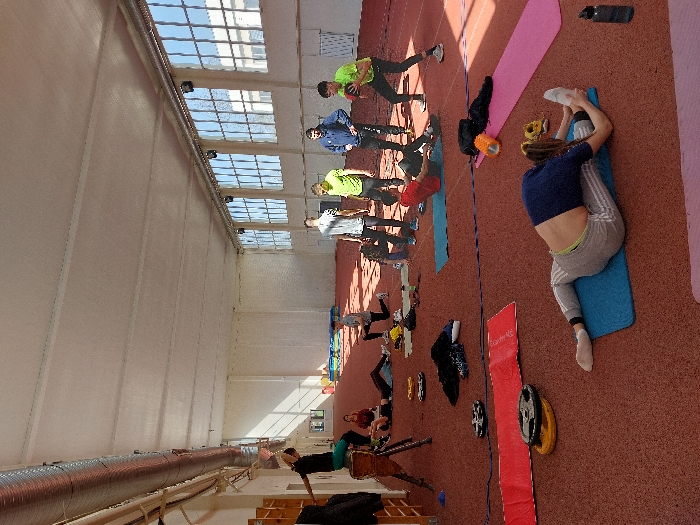 The image depicts an indoor sports facility located in Vratsa, Bulgaria. Approximately twelve individuals, primarily young adults in athletic attire, are engaged in various exercises on a reddish-brown sports-specific floor marked with white lines. The facility features light-colored walls, a white suspended ceiling with a prominent silver ventilation duct running along the left, and a series of large, multi-paned windows along the far wall admitting bright natural light. In the foreground, a female wearing a blue crop top and grey sweatpants is seated on a blue exercise mat, performing a wide-legged forward fold stretch. Nearby on the floor, red and black barbell weight plates are visible alongside a red exercise mat. Another individual is partially visible lying on their back on a blue mat, performing a supine twisting exercise. Various personal items, including water bottles, a black foam roller, and articles of clothing, are scattered on the floor around the participants. In the mid-ground, several individuals are positioned on or near exercise mats. One person is performing a lunge-like stretch, while another lies on their back. To the left, a person in dark clothing and green pants is balanced atop a wooden vaulting horse. In the background, a group of standing individuals in athletic wear includes one person holding a dark medicine ball. The overall scene indicates a group fitness or training session.