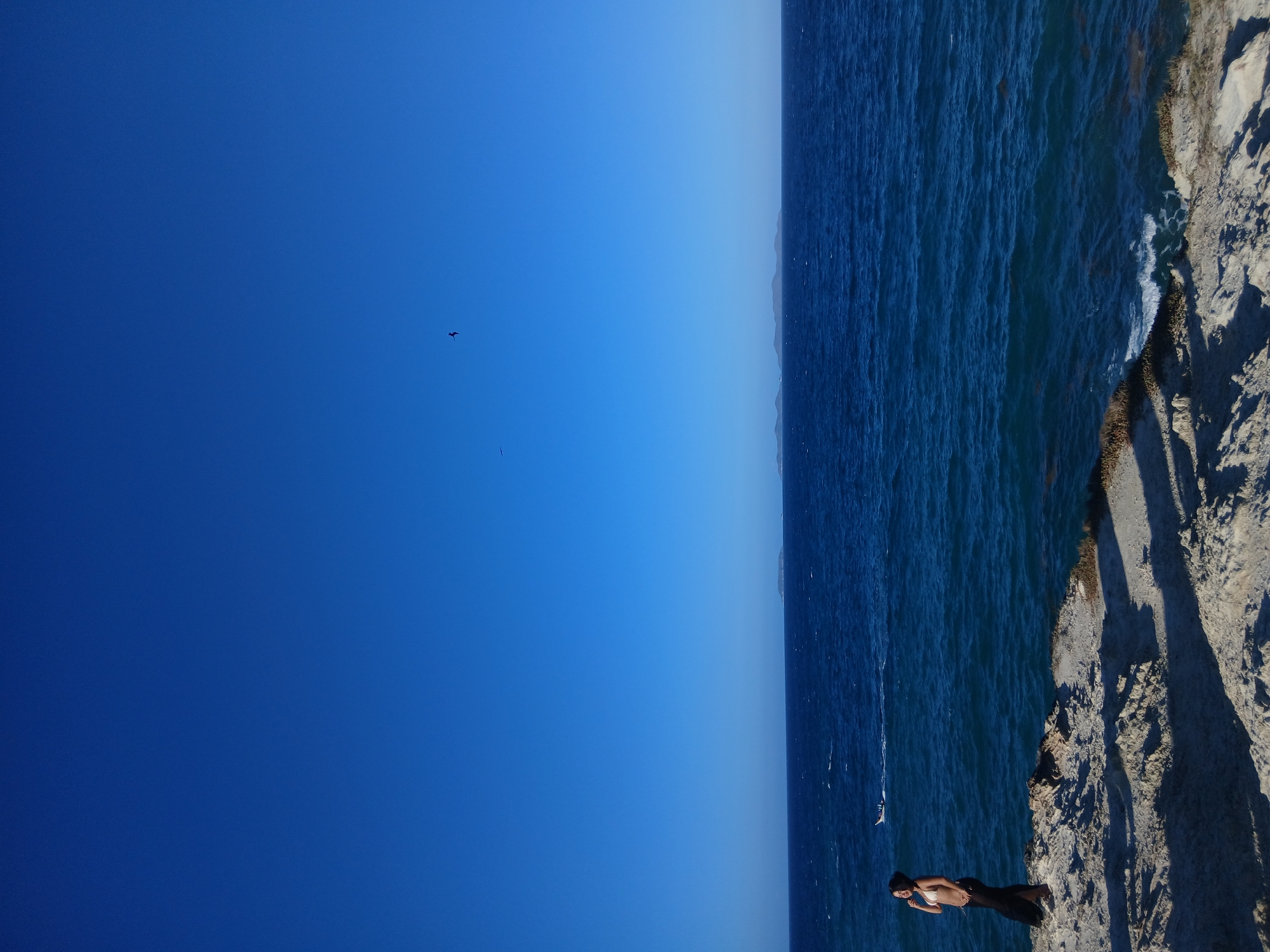 A slightly rotated medium shot captures a serene scene at Playa Parguito, Venezuela. The right of the frame features a rocky cliffside with long shadows, indicating the position of the sun. A person lies prone on the cliff's edge, close to the water. The vast, deep blue ocean fills much of the frame, meeting the horizon. Above, a clear, deep blue sky stretches out with a couple of small birds flying in the distance.