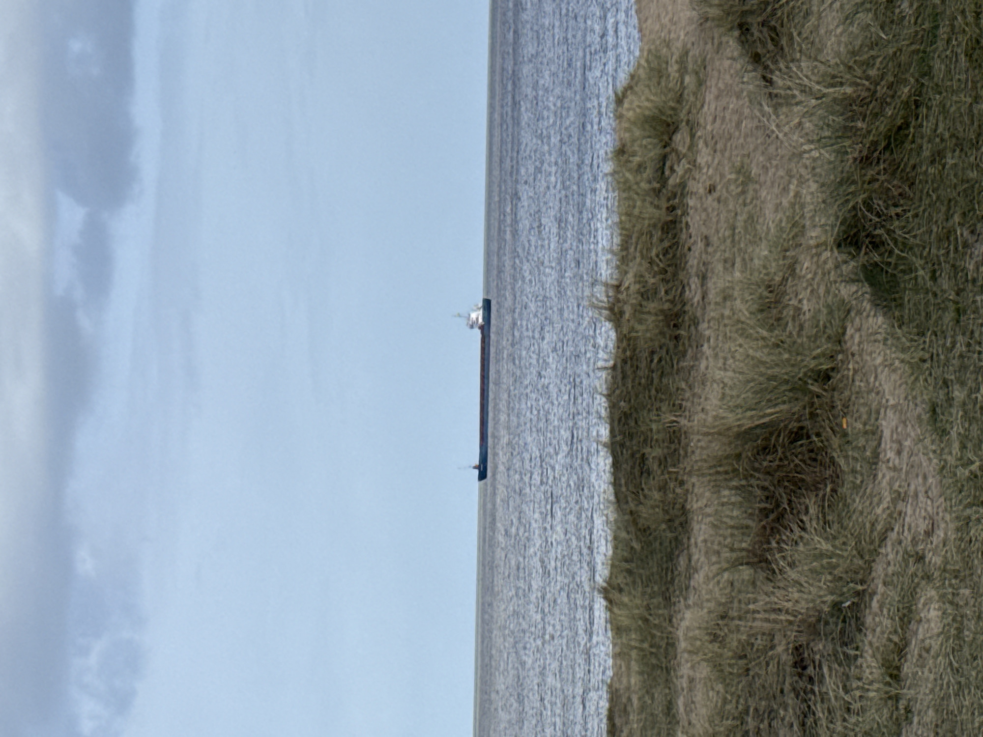 The image displays a coastal landscape in Gorleston-on-Sea, United Kingdom. The foreground consists of a sandy dune environment, populated with sparse, dry clumps of light green and brown dune grass. The midground features a wide expanse of dark grey-blue water, likely the North Sea, showing minor ripples on its surface. A cargo vessel with a long, dark blue hull and a white superstructure towards its stern is situated in the mid-distance on the water, slightly left of the frame's center. The vessel appears to be underway or stationary. The background comprises a light blue sky with several grey, diffused clouds, notably in the upper portions of the frame. No individuals are visible in the scene.