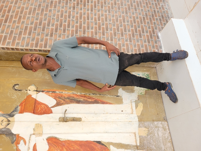 In Ebenebe, Nigeria, an adult male stands on a light-colored, possibly tiled or concrete, elevated platform. He wears a teal-grey short-sleeved polo shirt, faded black denim jeans, and dark blue closed-toe sandals with visible stitching. His hands are positioned near his hips, and his gaze is directed towards the viewer's right. The man has short, dark hair, light facial hair, and a slightly open mouth. To the left of the frame, behind the man, is a light brown wooden door featuring a worn full-length painting of a robed figure, presumably Jesus Christ, holding a shepherd's crook. A brass-colored door handle is present on the painted door. To the right of the frame, behind the man, a section of a reddish-brown brick wall with white mortar is visible.