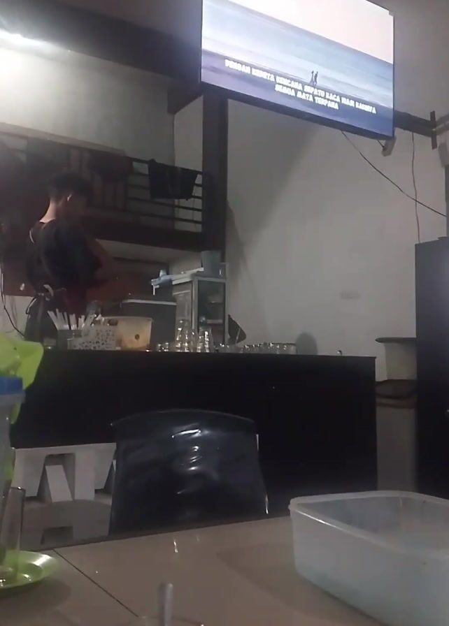 The interior of a small restaurant is shown in this video. A man is working behind the counter, preparing drinks. A TV hangs on the wall, showing a program with subtitles. There are tables and chairs set up in the foreground, with a clear plastic container, a small glass with a spoon, and an orange plate on one table. Two individuals are seated at a table in the background, one looking at their phone. A refrigerator stands against the back wall, illuminated inside. The room has a casual, unadorned feel. A loud hissing sound is heard at the beginning of the video.
