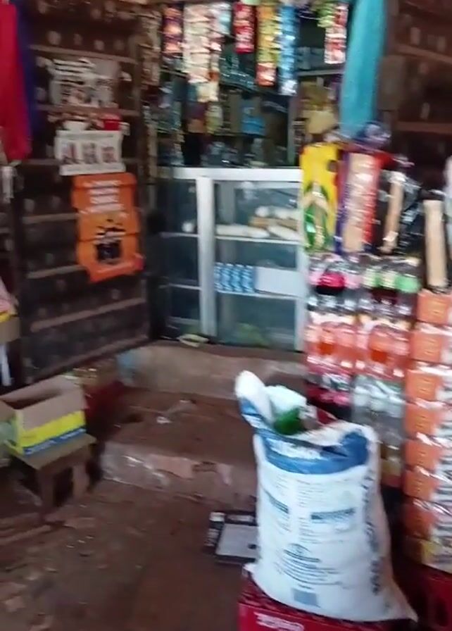small, cluttered shop interior. There are shelves filled with various goods, including snacks, drinks, and other items. A large bag labeled "SUGAR" sits on a red crate. There is a small refrigerator cabinet and a collection of cardboard boxes and advertisements. The floor is unpaved and appears dusty. The lighting is dim, and the space appears cramped. There are no people visible in the video.