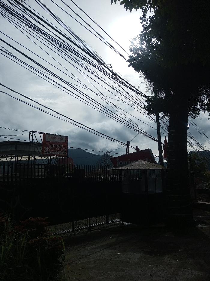 A cloudy sky with overhead power lines dominates the scene. The sun is partially obscured by a tree on the right. In the midground, there's a fence and structures with signage, partially obscured by shadows. A hill is visible in the background, adding depth. The foreground is dark, obscuring ground details. The image conveys a sense of overcast weather and urban infrastructure encroaching on nature.