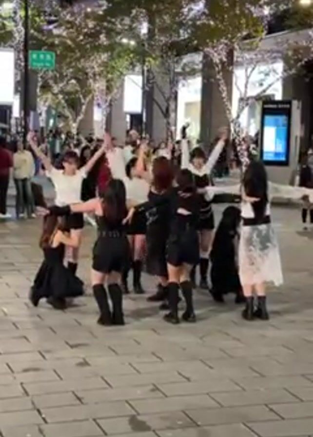 A group of around ten young women is performing a dance routine on a brick-paved pedestrian street
