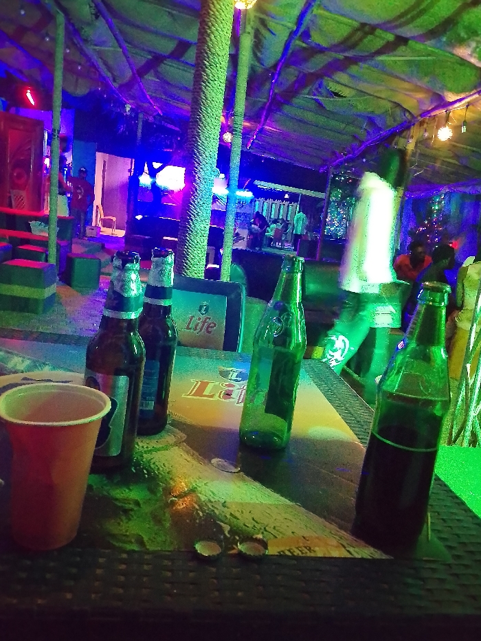 An orange plastic cup and four beer bottles, two brown and two green, sit on a table. Bottle caps rest on the table's surface. A “Life” beer advertisement is visible on the table. The setting appears to be a bar, evidenced by the presence of other patrons and blue lighting. Thatch is seen above the bar.