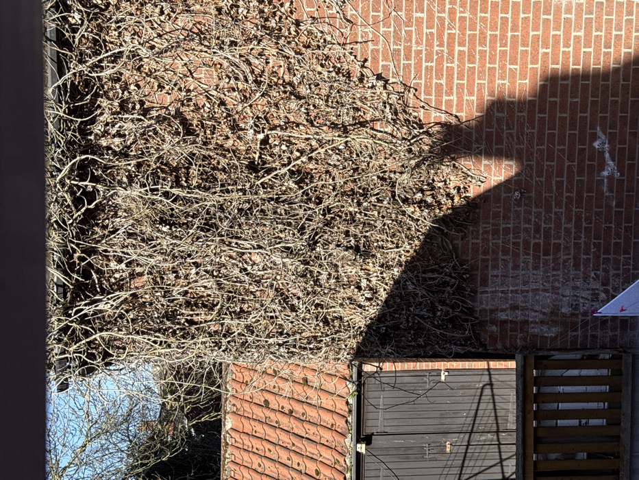 The image depicts an outdoor scene in Boston, United Kingdom, under bright, clear conditions. The central and right portions are dominated by a red-brown brick wall, extensively covered with dense, leafless climbing vegetation. Strong direct sunlight illuminates the upper and right areas of this wall and foliage, casting intricate shadows from the bare branches onto the brickwork. A large, well-defined, angular shadow falls diagonally across the lower-left and lower-central sections of the wall and vegetation. To the left, below the main mass of vegetation, a terracotta-tiled roof with visible moss covers part of a structure. Beneath this roof, two dark-stained wooden doors, featuring vertical planks and secured by metal latches, are visible. Below the doors, a wooden railing composed of vertical slats is partially observed. The upper-left corner reveals a clear blue sky and the silhouettes of bare tree branches. In the bottom-left corner, a small, triangular white object with red markings is partially visible. No individuals are present in the scene.