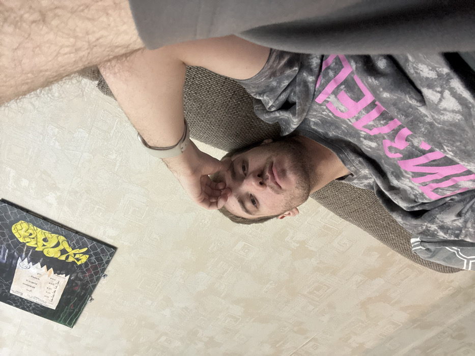 An angled perspective shows a person reclining. The individual has fair skin, short brown hair, and stubble. They wear a gray tie-dye shirt with pink lettering and a light-colored smartwatch. Part of an upper leg is visible in the upper left corner. Adjacent to the person is a gray, textured sofa. To the left is a black record sleeve with yellow and white drawings on the front. The background is a light beige tile floor.