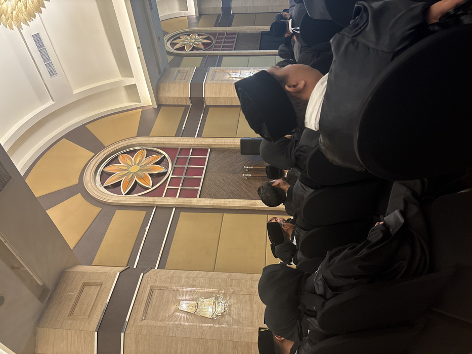 The image displays an interior view of a large, ornate event hall or ballroom in Surabaya, Indonesia, occupied by a seated audience. The perspective is from the rear of the audience, looking forward. Numerous individuals are visible, mostly from behind, dressed in formal black robes. Many men wear black peci (songkok) hats, and several women wear black hijabs. All visible attendees are seated in rows of black upholstered chairs, oriented towards an unseen front of the hall. The environment features high ceilings with intricate archways and elaborate wall decorations. The walls are paneled with alternating sections of beige/light brown marble-like texture and dark brown horizontal bands. Prominent architectural features include large arched alcoves, each containing a distinctive circular, stained-glass style panel depicting an orange and yellow floral design. Below these circular elements are rectangular sections, dark red with silver horizontal bars. A multi-tiered crystal chandelier hangs on the left wall, and a larger, golden-toned chandelier is partially visible on the ceiling in the upper right. A black audio speaker box rests on the floor towards the front-right of the visible audience. Overhead, air conditioning vents and recessed lighting are visible within the ceiling structure.