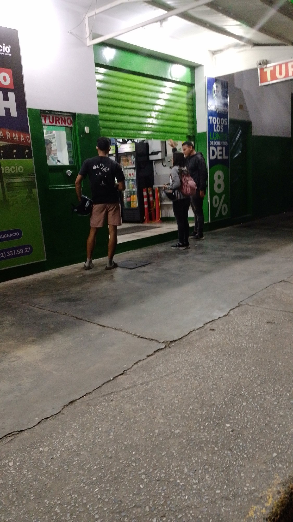 The image depicts three people standing outside a business in Tinaquillo, Venezuela