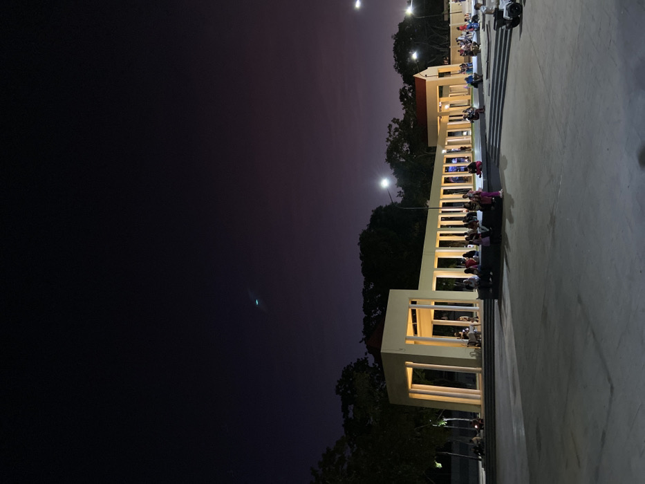 A nighttime scene shows a long, open-air structure illuminated with warm light. People are seated or gathered along its length. Steps lead down to a paved area. The sky is dark, with a hint of purple or mauve near the horizon. Streetlights are visible above the trees, casting a glow on the scene. The perspective makes the building appear elongated.