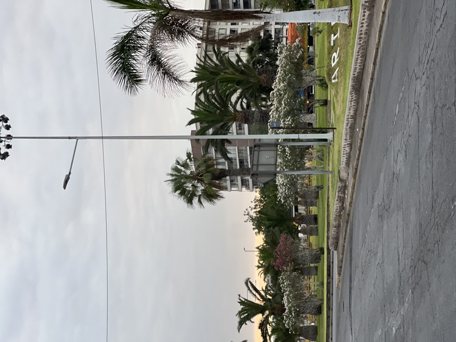 The image displays an urban outdoor scene in Arica, Chile, observed from a street-level perspective looking towards a landscaped median. The foreground features a cracked, dark asphalt road surface. To the right, a low, textured concrete curb separates the road from a grassy median. Within this median, numerous palm trees of varying heights are present, along with several bushes featuring white flowers and a cluster of bushes with pink flowers. The letters "ARICA" are spelled out in white-painted concrete on the grass in the lower right portion of the median, with "ART" clearly visible. A prominent, tall, light-colored metal streetlamp pole stands centrally, featuring a single, extended streetlamp arm and a circular cluster of multiple floodlights at its apex. A dark overhead wire horizontally traverses the upper third of the frame. In the background, behind the vegetation, a multi-story building with a light facade and numerous windows/balconies is visible. A partially obscured vehicle, appearing to be a blue and orange truck, is discernible through the foliage in the mid-ground. No individuals are visible. The sky is overcast and grey, showing a faint orange tint on the horizon to the left, indicating a transitional period of daylight.