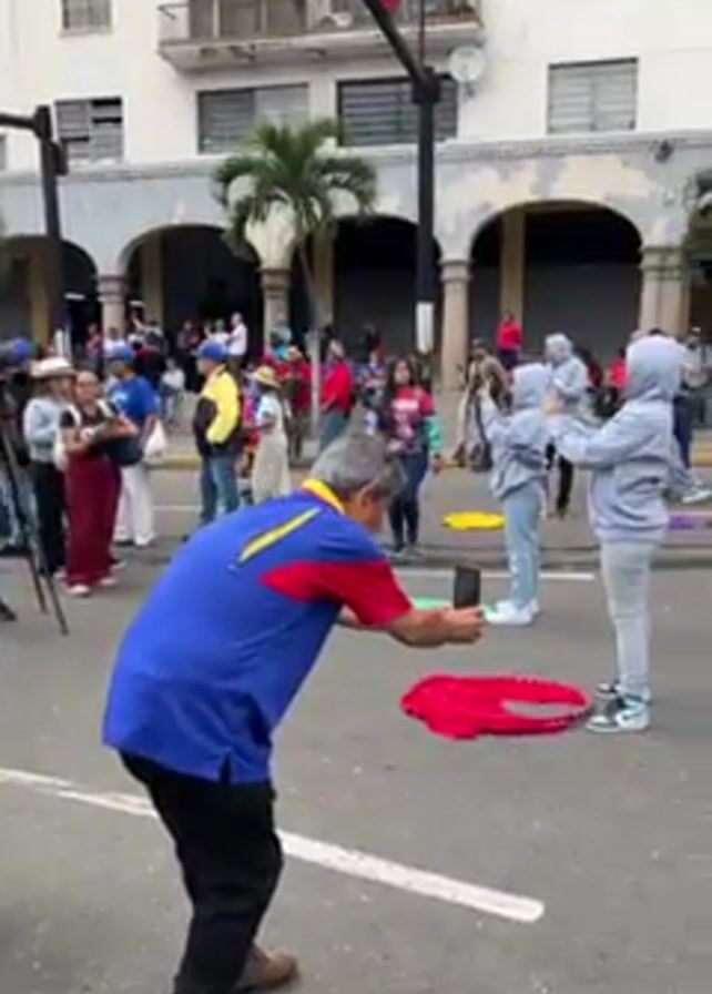 A group of people are gathered on a city street. Many are wearing clothing with the colors of the Venezuelan flag (yellow, blue, and red). Some are holding signs with political messages in Spanish. One sign says "Chavez Vive," which means "Chavez Lives." Several people are holding what appear to be oversized wooden swords. A child stands in front of a woman, holding a sign with the colors of the Venezuelan flag. A Venezuelan flag lies on the ground. A man gestures and speaks to the camera. There is a camera crew filming the event. Buildings line the street, and the weather appears to be sunny. Some people are walking in the background.