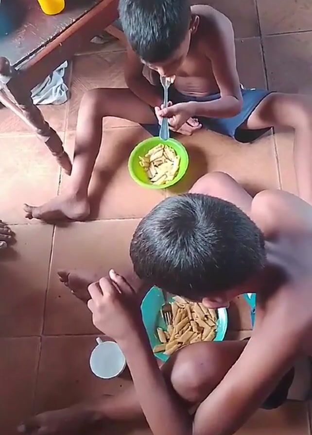 Two shirtless boys sit on a brown tiled floor and eat pasta