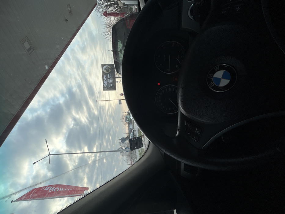 - "The image presents a forward-facing view from the interior of a stationary BMW vehicle, indicated by the steering wheel's logo and visible instrument cluster showing a speedometer at zero, a tachometer at zero, and an external temperature of +4" by FM-S4Ib52, licensed under CC BY 4.0