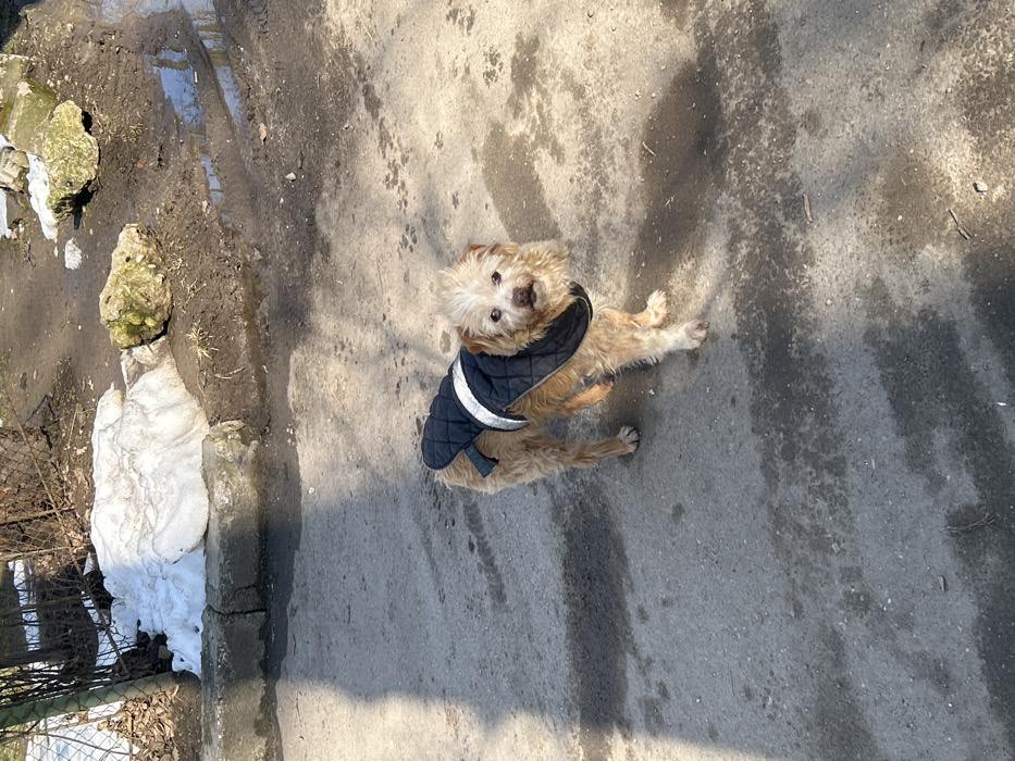 - "A small, light brown, scruffy-haired terrier-type dog, wearing a dark quilted vest with a prominent white horizontal stripe, stands on a grey paved surface" by FM-nazRh2, licensed under CC BY 4.0