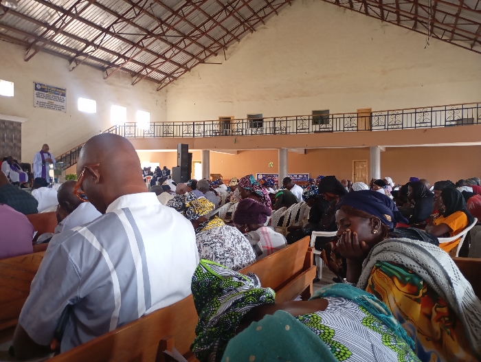 The image depicts an indoor gathering within a large assembly hall, identified as the Church of Christ in Nations (COCIN) Central Bwong Kasa, located in Jos, Plateau State, Nigeria