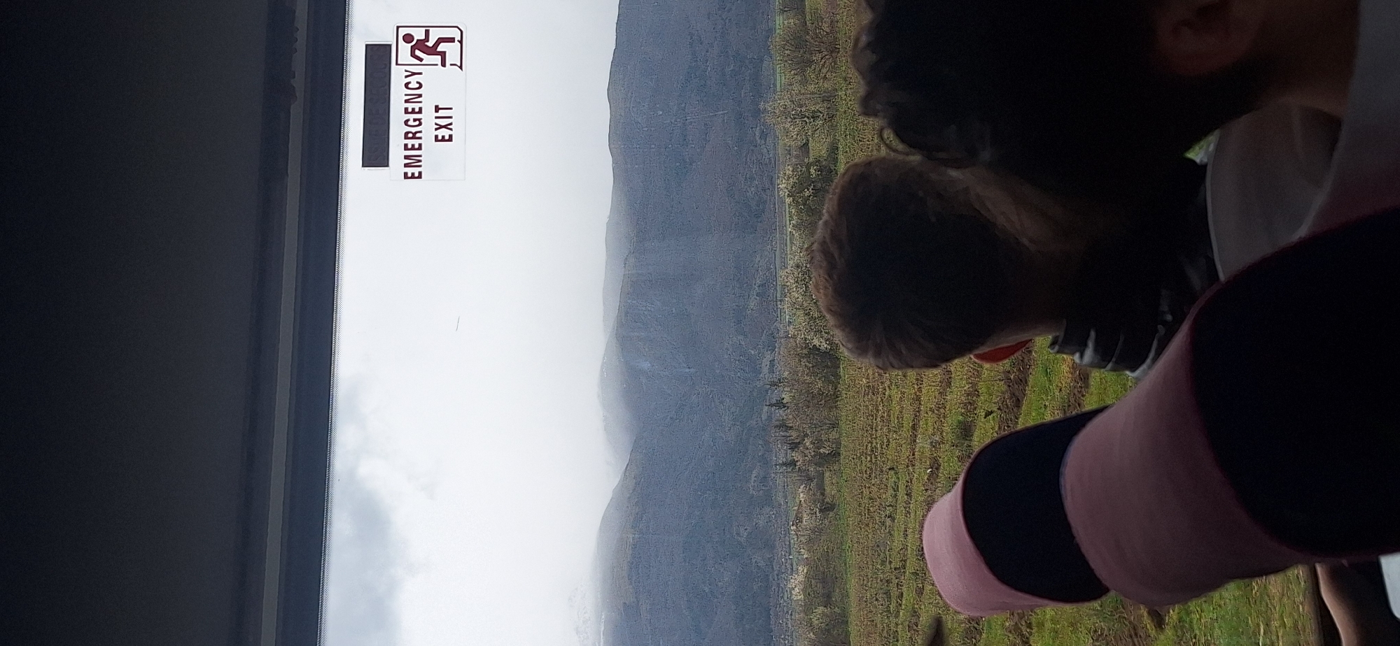 view from inside a vehicle, likely a bus or train, looking out through a window. Affixed to the window frame is a sign that reads "EMERGENCY EXIT" with a corresponding graphic. Outside the window, a mountain range is visible in the background, obscured by fog or clouds. Closer to the foreground, a landscape of green fields and trees is seen. The angle suggests the perspective is from an elevated position. Within the vehicle, parts of people's bodies are visible, indicating the presence of passengers. The location is Tazha, Bulgaria.