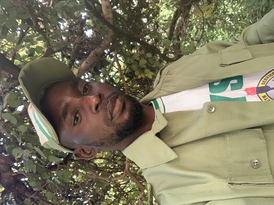 A dark-skinned adult male is depicted in a close-up, chest-up portrait, looking directly at the viewer with a neutral expression. He has short dark hair and a well-trimmed beard. He is wearing a light olive-green long-sleeved shirt or jacket with shoulder epaulets and two buttoned chest pockets. Underneath, a white t-shirt with green stripes on the collar and a partial graphic, including the letters "YS" in green and a logo with a torch and "YOUTH SERVICE" text, is visible. An olive-green baseball cap, featuring white and green stripes on the brim and a small red and white emblem, is worn on his head. The background is a dense, blurred composition of green foliage and tree branches, indicating an outdoor, natural setting. The specific location within the city of Kubi A, Nigeria, is not visually identifiable in the image.