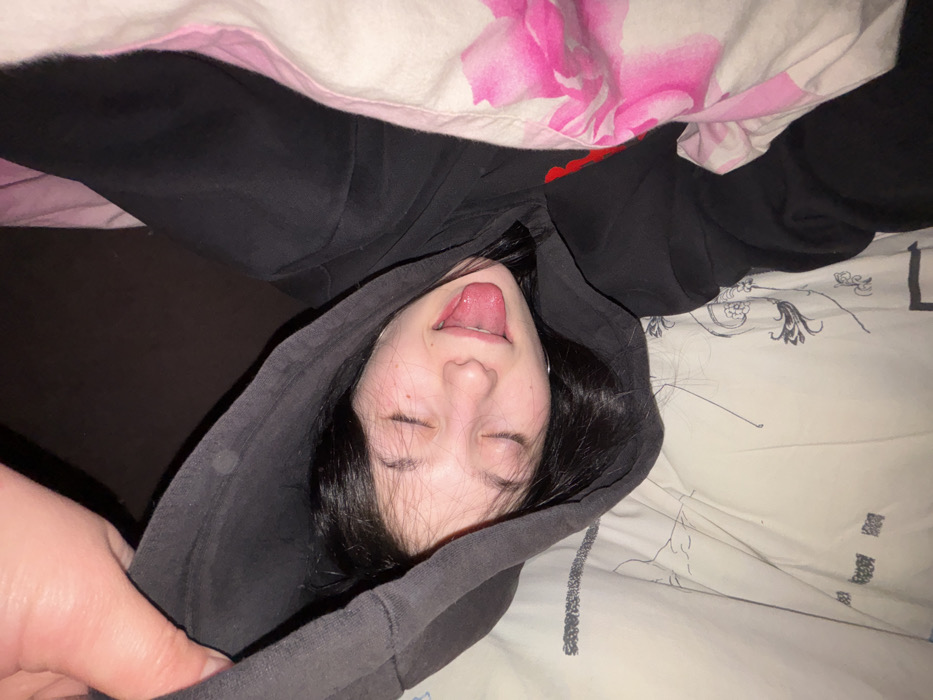 A fair-skinned young woman lies in bed, upside down, eyes closed, sticking her tongue out. She wears a black hoodie pulled up over her head. Above her is a blanket with a pink flower design. A hand pulls at the hoodie. The bedding underneath has a swirly, decorative pattern. The image appears to be taken indoors, with a mix of natural and artificial light.