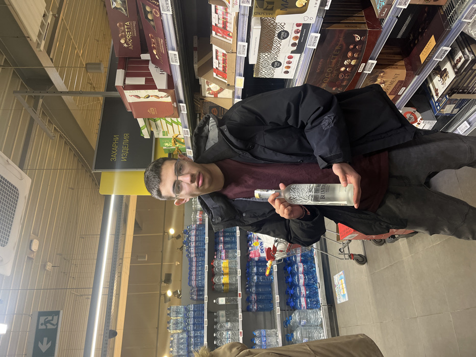 A young male, approximately late teens to early twenties, stands centrally in a supermarket aisle located in Vratsa, Bulgaria, facing directly towards the camera