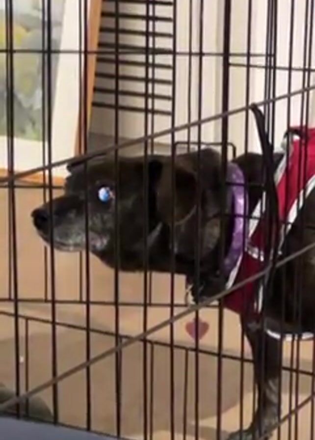 A small, dark-colored dog is inside a wire crate. The dog wears a red harness with white trim and a purple collar with a heart-shaped tag. The dog’s fur is graying around its face. The camera moves, and the dog steps forward to be closer to the camera, sticking out its tongue. A framed picture is visible in the background. The environment appears to be indoors.