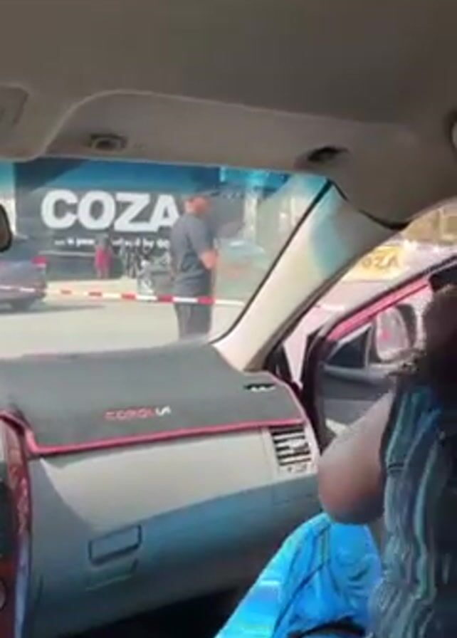 interior of a car, likely a Toyota Corolla, with a red dashboard and door panels. A person wearing a blue, green, and black patterned top is sitting in the back seat and opens the car door. Another person, wearing a white floral top and maroon pants, exits the car after the first person. They are wearing pink Crocs. Outside the car, a man in a black shirt and hat stands near a barrier with a large sign that reads "COZA" visible in the background. Other cars and people are also visible outside the car.