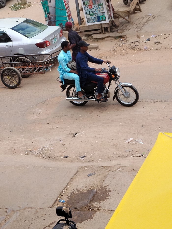 The scene depicts an outdoor urban environment in Fagge A, Nigeria. Two adult males are riding a red motorcycle towards the right of the frame. The driver wears a dark blue top, dark blue trousers, a black baseball cap, and black sandals. The passenger, seated behind the driver, wears a light blue long-sleeved top, light blue trousers, and light-colored sandals, carrying a light-colored bag over his left shoulder. To the left, a silver Toyota Corolla sedan is stationary, facing away from the viewer, with a two-wheeled utility trailer positioned closely behind it; the trailer's visible wheel appears deflated. A third adult male, wearing a dark shirt and a maroon cap, stands near the silver car and a roadside stall. The stall features items displayed on shelves, likely electronics. The ground consists of unpaved reddish-brown dirt intermixed with sections of cracked concrete, including a dark liquid spill. Scattered debris and small rocks are visible throughout the foreground and midground. A yellow fabric structure partially obstructs the lower right corner.