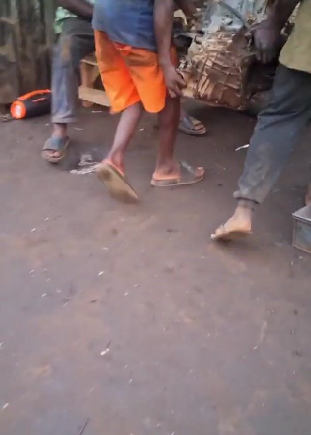 In an auto shop environment, three individuals wearing casual attire and sandals work together to carefully set down a heavy, oil-covered automotive part onto the floor. The floor of the shop is a dirty, slightly reflective, and possibly oil-stained surface. Next to them is a small, weathered metal toolbox. The background reveals sections of the auto shop with tools and various equipment suggesting an automotive repair setting.