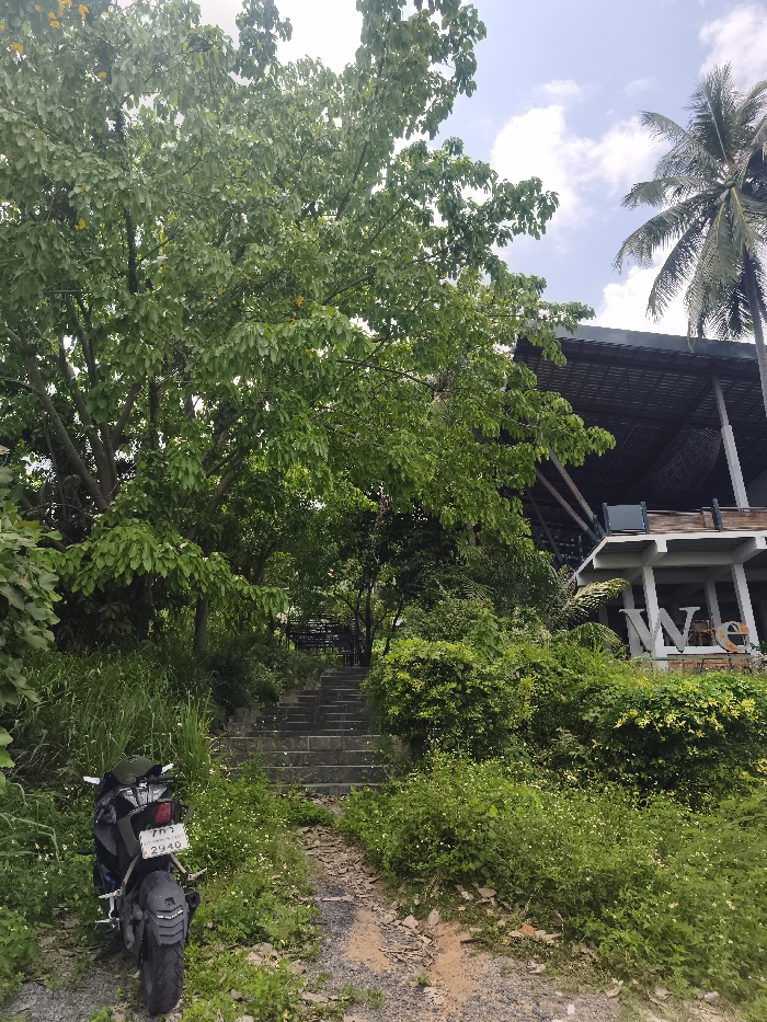The image depicts an outdoor scene in Baan Hua Thanon, Thailand, characterized by lush vegetation and a partial view of a building. In the lower left foreground, a dark-colored motorcycle is parked on a dirt and gravel path. The motorcycle displays a white license plate with Thai script and the number "2940". This path leads towards a set of approximately 10-12 grey concrete or stone steps that ascend a vegetated slope, partially obscured by dense green foliage and trees. A large tree with broad green leaves and scattered yellow flowers occupies the left side of the frame. To the right, a multi-story building is visible, featuring a dark, expansive roof, white lower-level structures, and decorative elements including large white letters spelling "WE" affixed to its exterior. A tall palm tree is situated to the far right, extending above the building's roofline. The sky is partly cloudy with visible blue sections. No individuals are present in the scene.